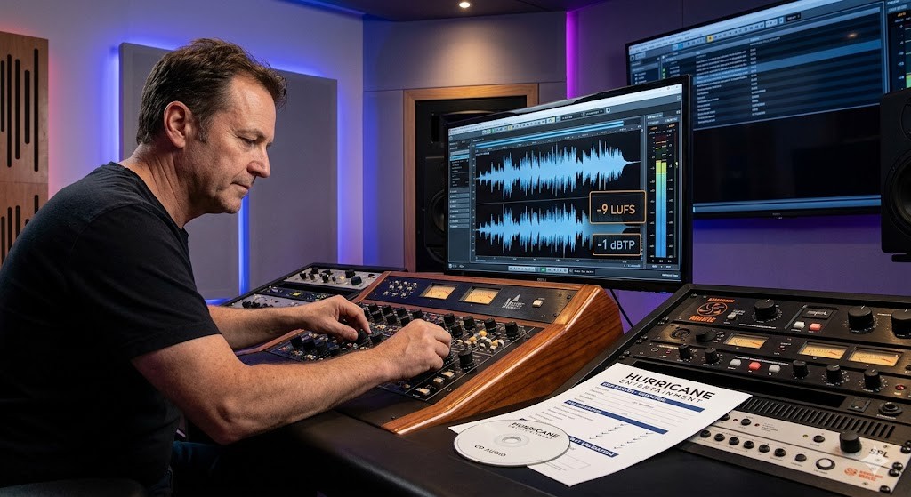 Le mastering ne consiste pas simplement à augmenter le volume. Notre rôle est d’ajuster les niveaux, l’égalisation, la dynamique et les transitions entre les pistes pour obtenir un rendu homogène. Pour un CD, nous visons un niveau de loudness autour de –9 LUFS intégré, avec une crête maximale de –1 dBTP, afin de conserver un son puissant sans clipping ni saturation.